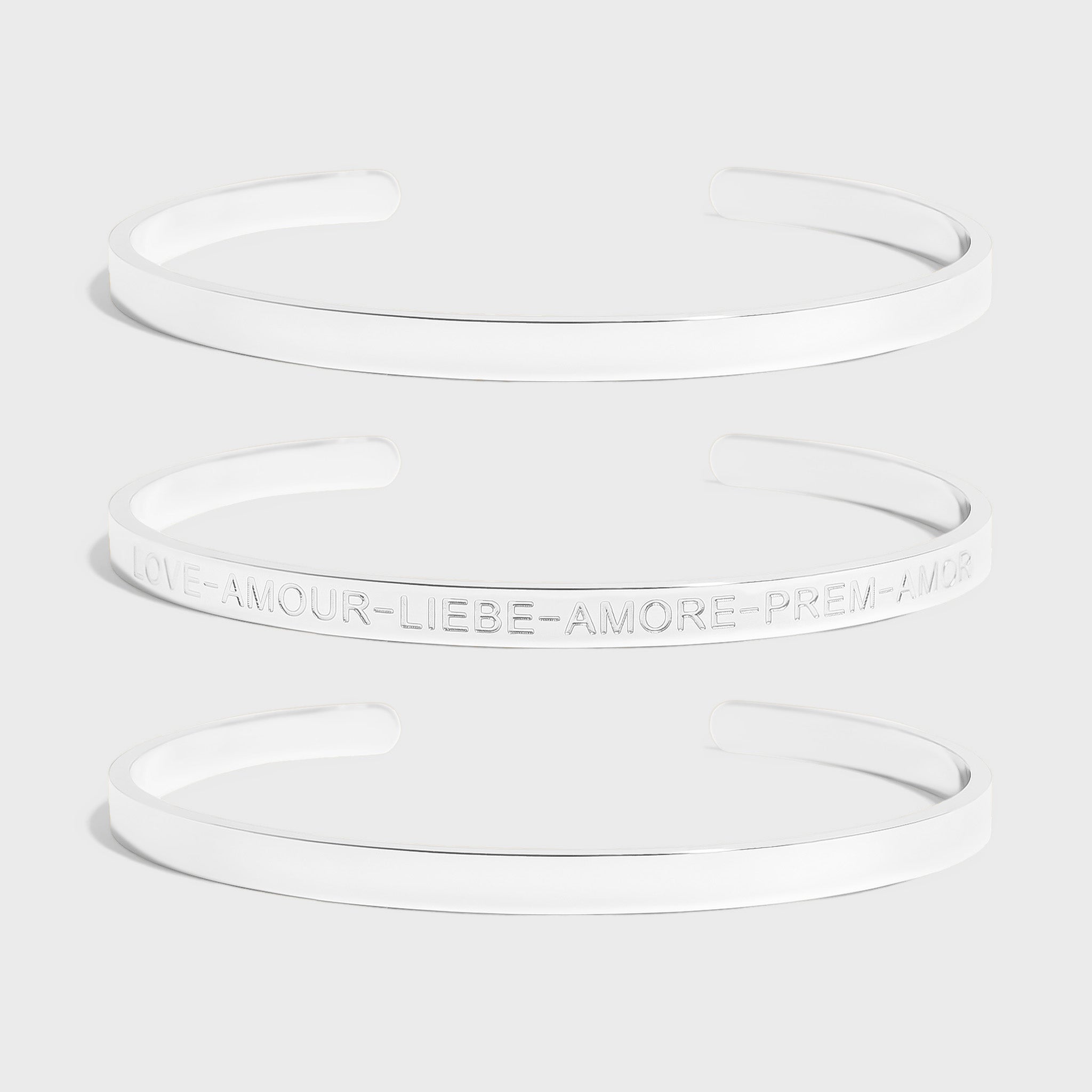 Timeless and meaningful, our Love Languages Bangle Set features 3 bangles - two sleek, minimalist bangles paired with a third engraved with word "love" in multiple languages. Elegant on their own or stacked, these bangles are a beautiful reminder that love connects us all.
