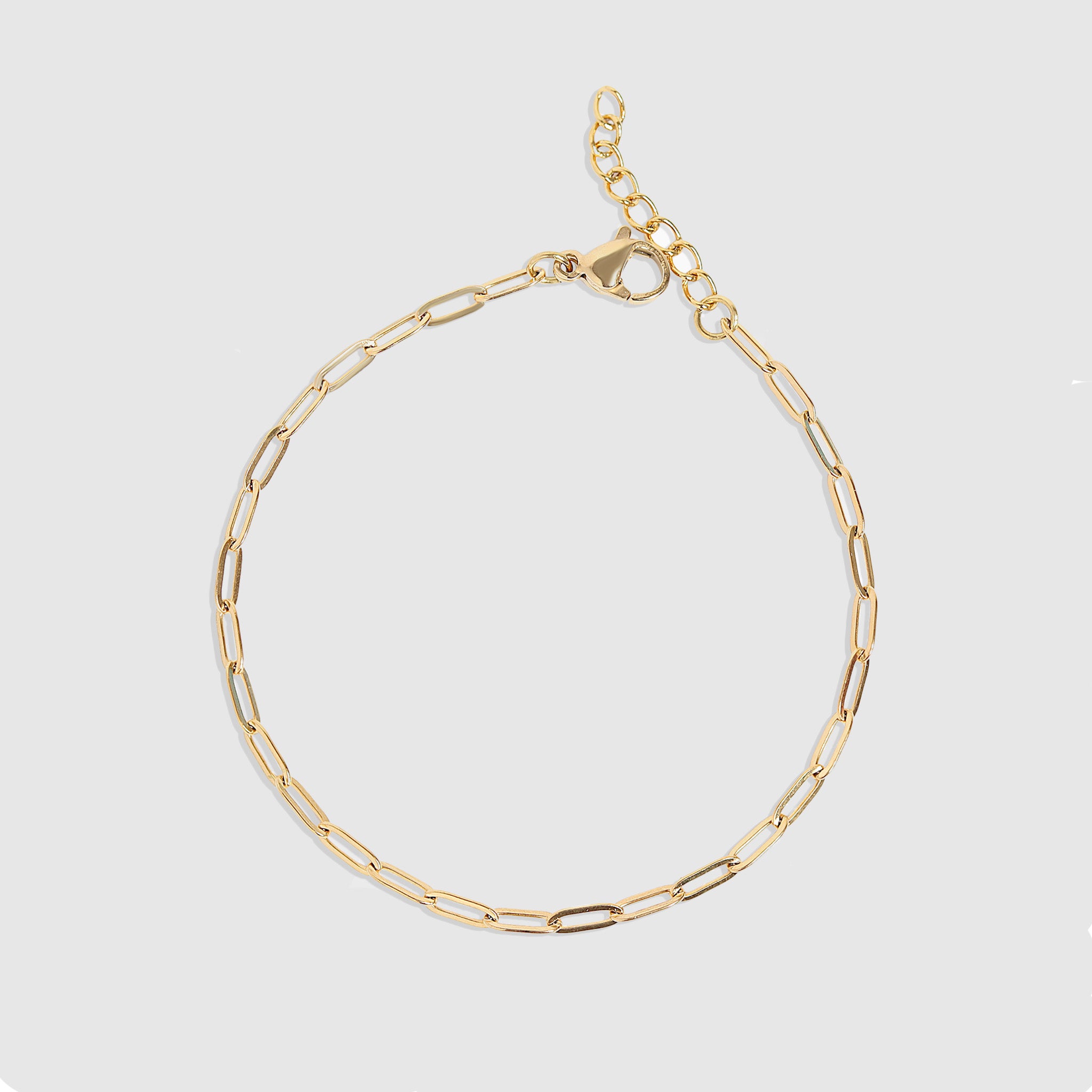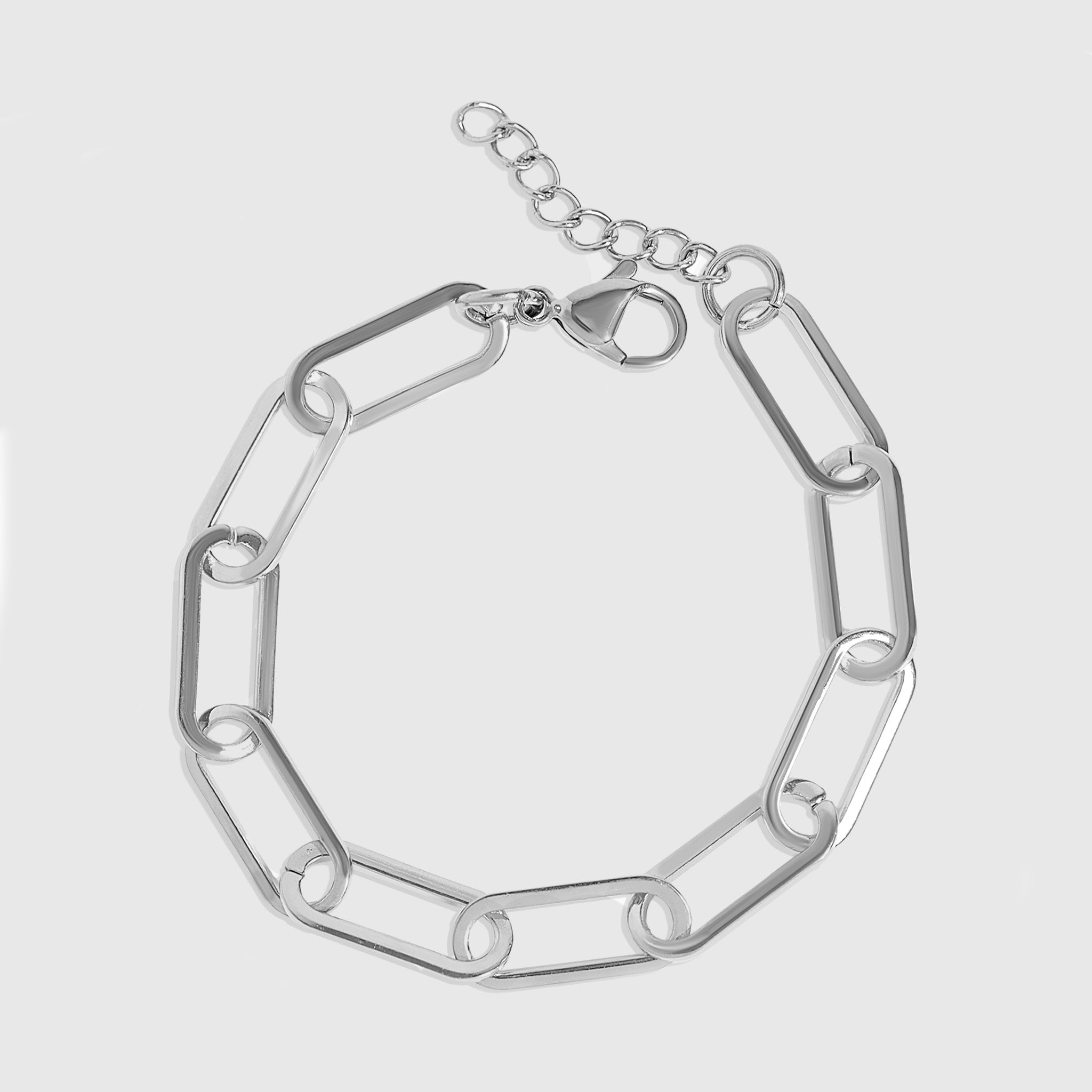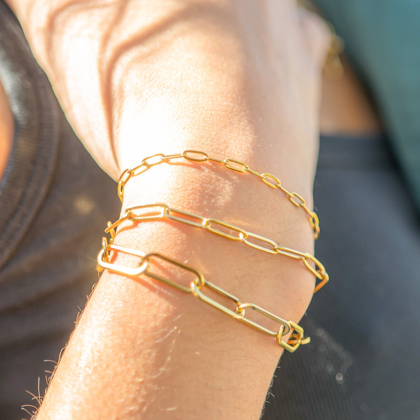 Sleek, bold, and effortlessly modern, the Paperclip Chain Bracelet is you go-to for everyday edge. Available in two sizes, 2.5mm for a subtle shine and 6.5mm for a stronger statement, this versatile piece stacks beautifully or stands confidently on its own. Clean lines meet timeless design in a bracelet that moves with your style!