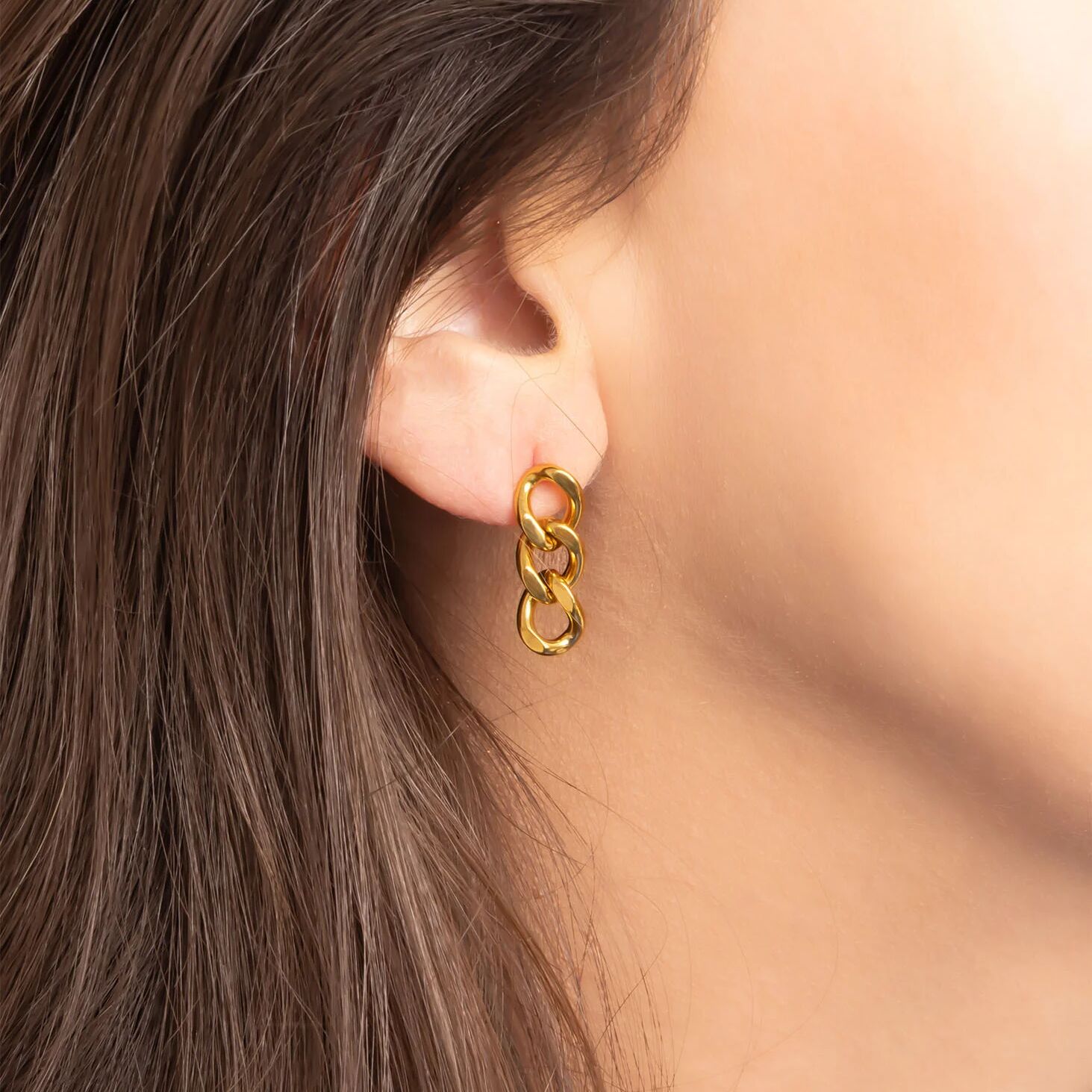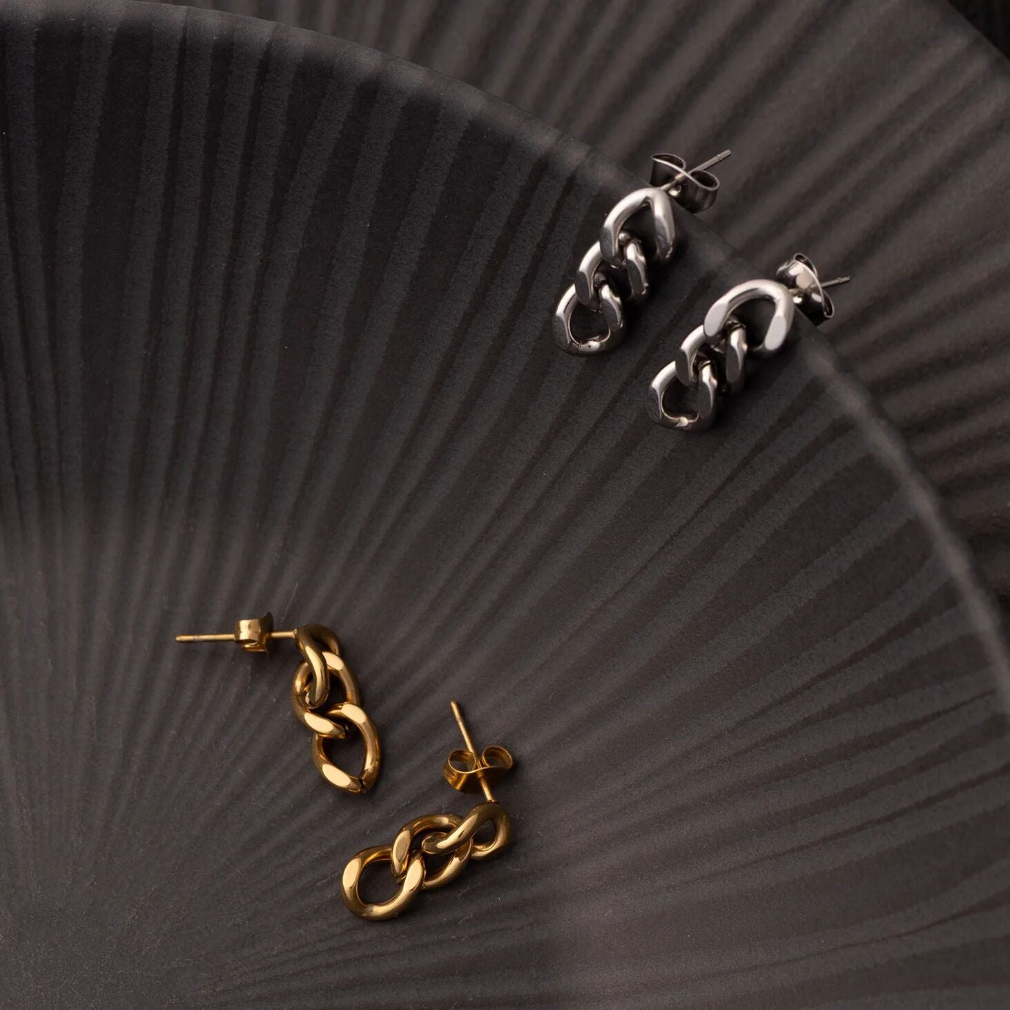 These Curb Chain Dangle Earrings are sleek and modern. They're lightweight and easy to wear, adding subtle movement and a polished edge to any outfit. Perfect on their own or paired with other simple pieces for a layered, everyday look.