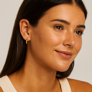 A pair of gold-colored hoop earrings with a textured surface, displayed against a white background