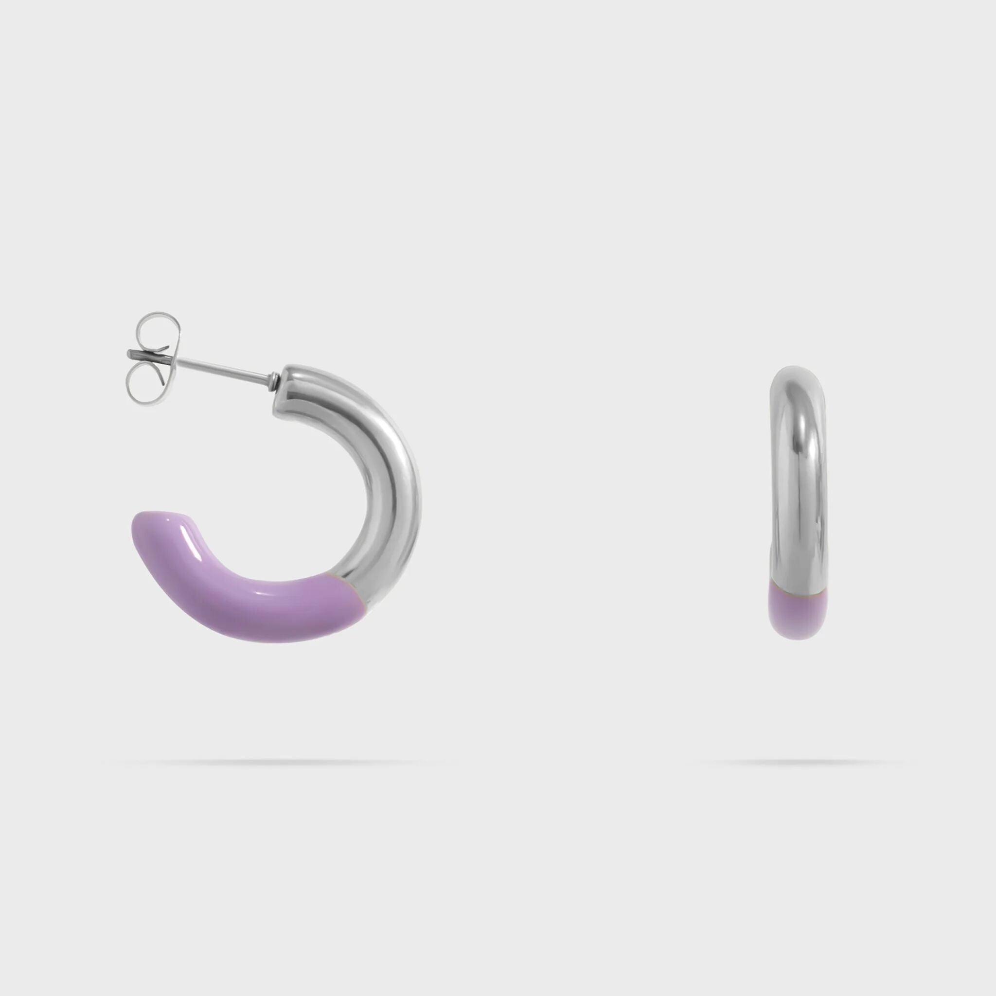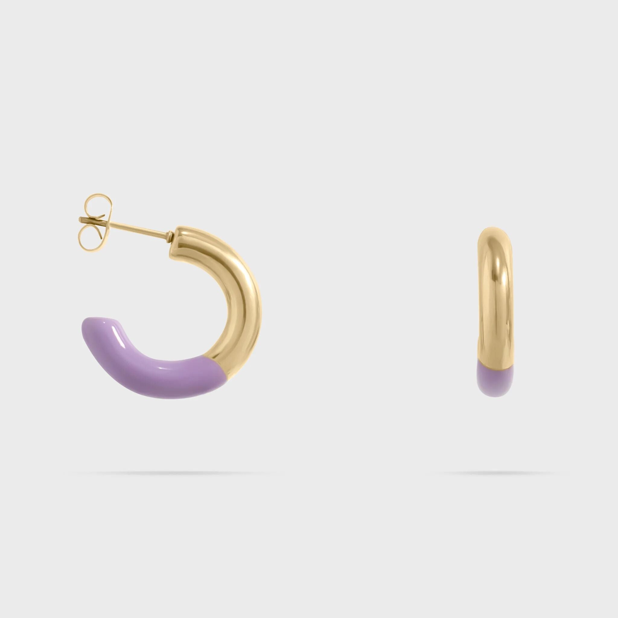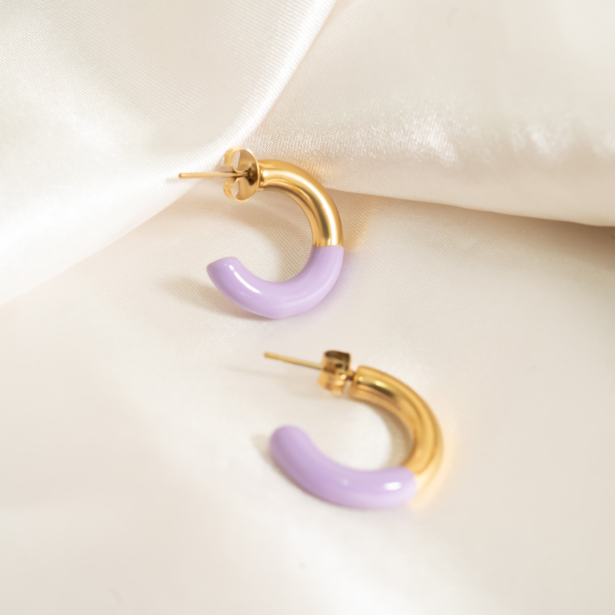 Elevate your look with a playful twist of color. Our 18K Gold PVD Stainless Steel Purple Epoxy Huggie Hoop Earrings blend modern style with everyday durability. Each mini hoop features a smooth layer of vibrant purple epoxy seamlessly paired with a radiant 18K gold PVD finish, creating a chic contrast that stands out effortlessly. Lightweight, comfortable, and refined, these hoops add the perfect pop of personality to any outfit—from casual days to dressed-up moments.
