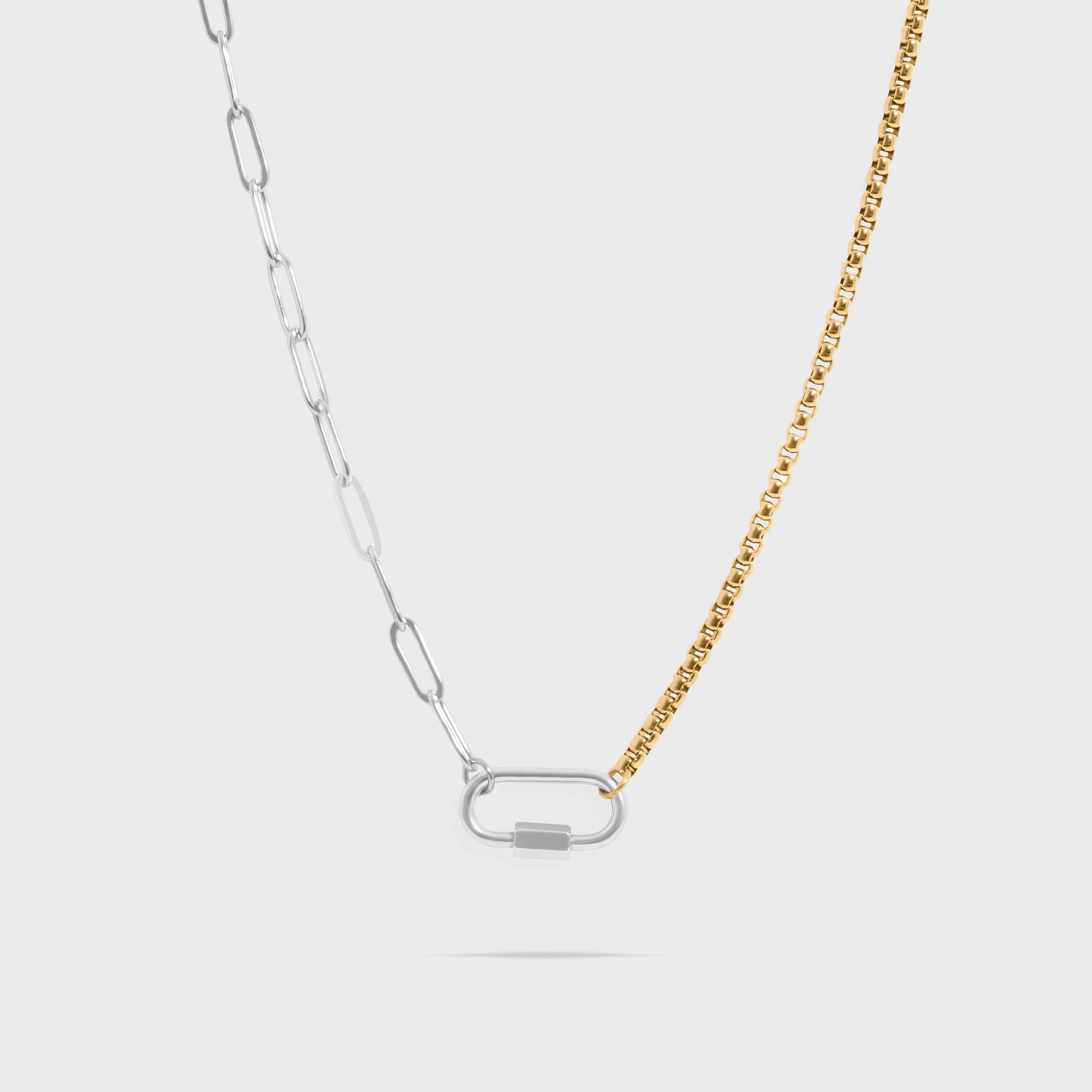 Contemporary and versatile, our Mixed Metal Split Chain Paperclip Charm Holder Necklace blends gold and silver links for a striking contrast. One side paperclip, the other, a rounded box chain for added flair. Finished with a bold carabiner clasp, it captures modern elegance and everyday strength in one seamless design. Perfect for adding your favorite charms, simply screw the carabiner open to build your personalized charm necklace!