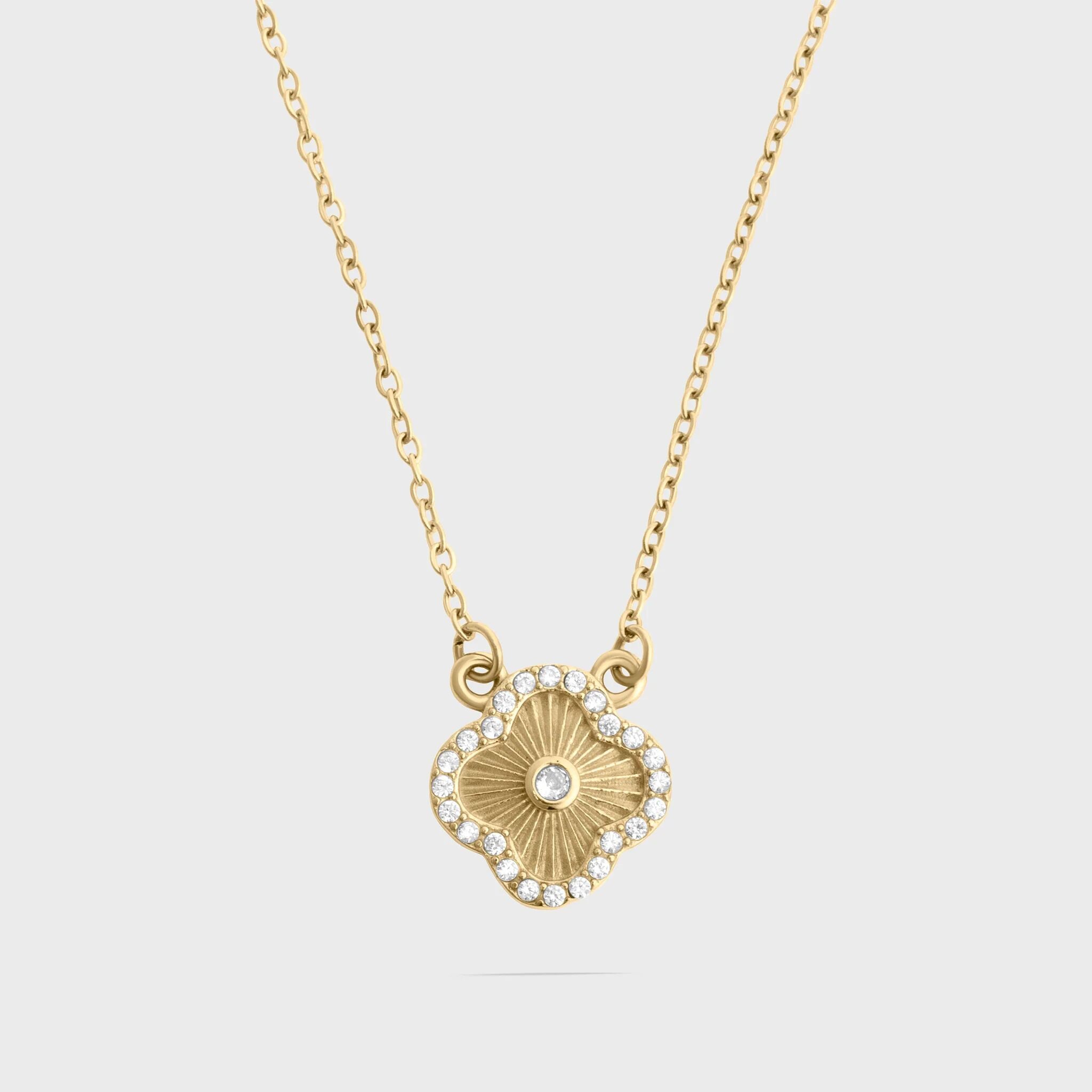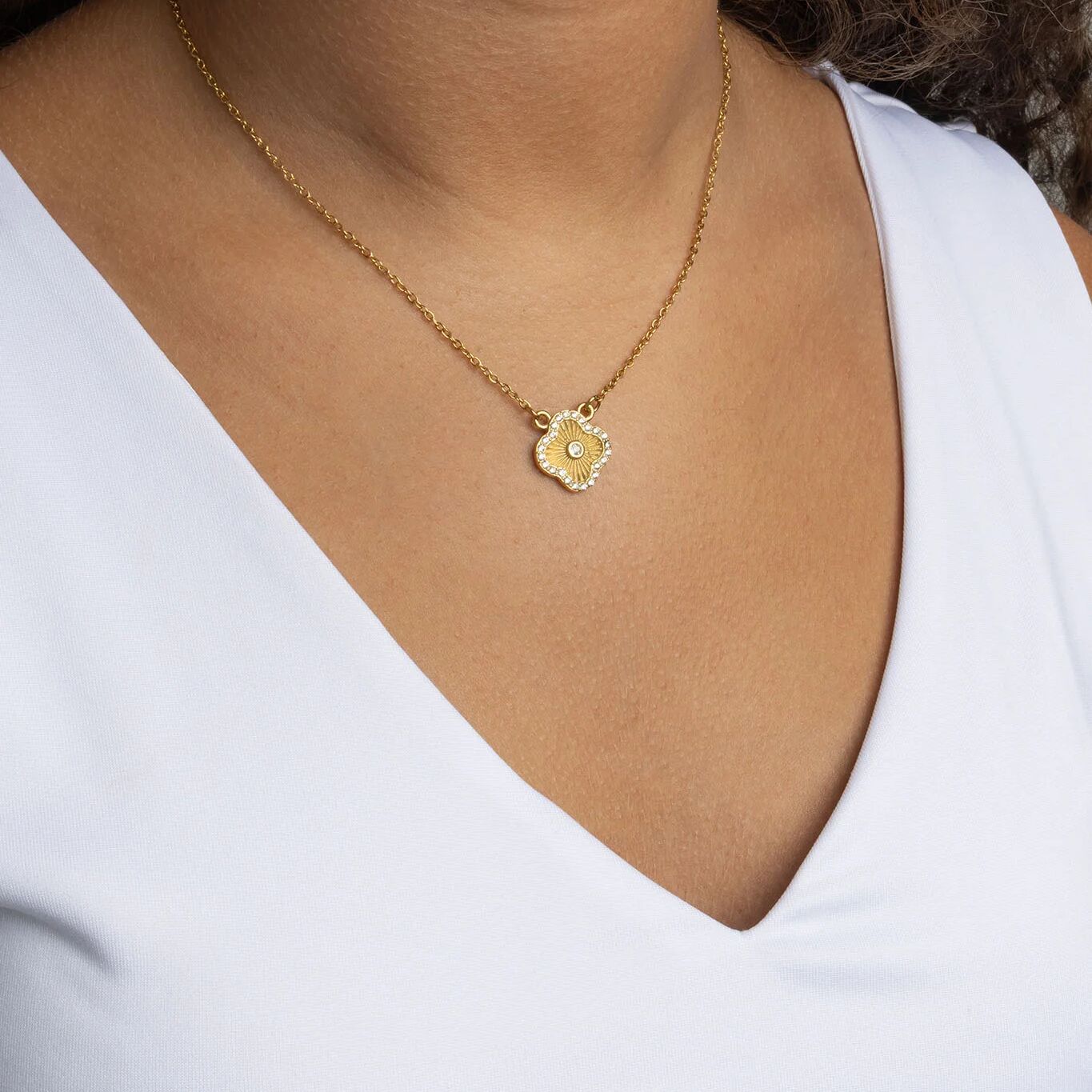 The Floral Motif Necklace features a delicate floral-inspired pendant with a center stone that sits lightly at the neckline, adding just the right touch of detail. Inspired by natural forms and current motif trends, it brings a fresh, wearable elegance to any look.