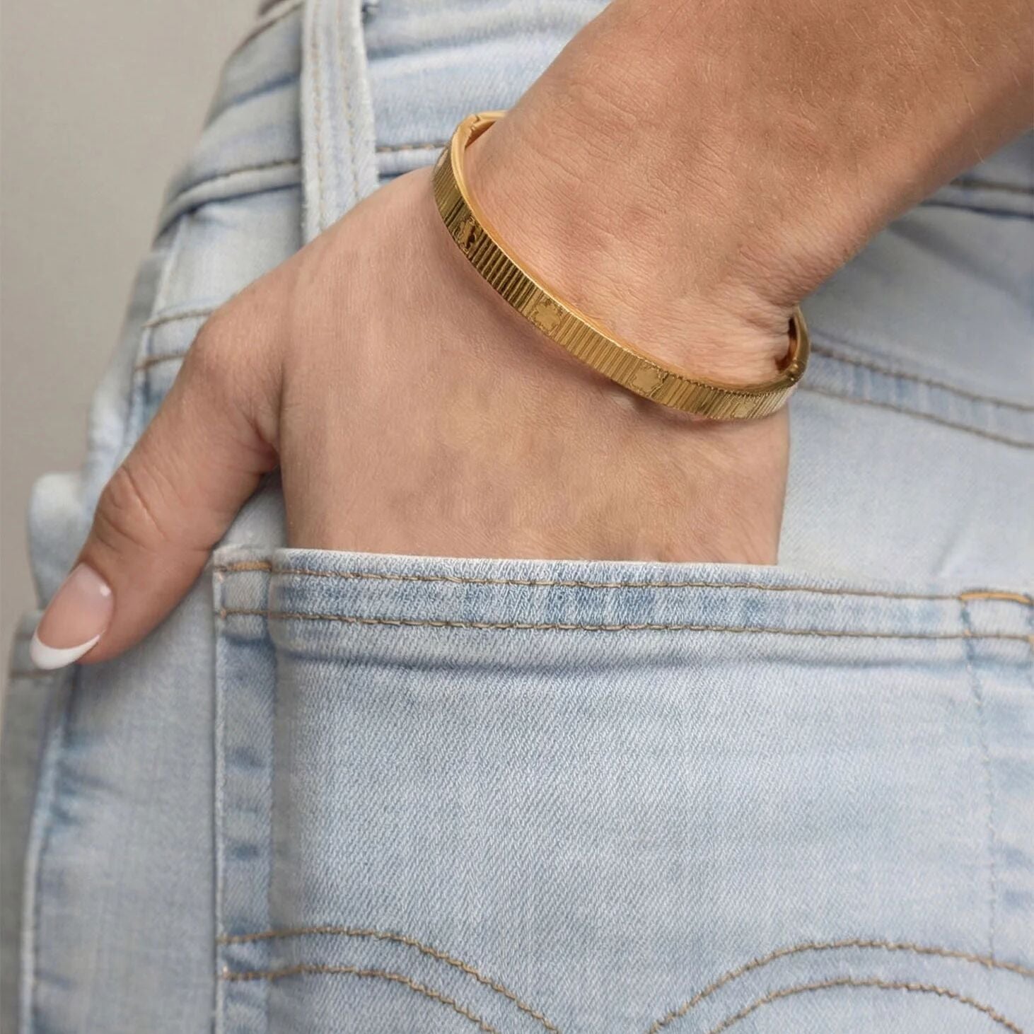 The Fluted Bangle pairs sleek design with subtle texture, creating a piece that's both modern and timeless. Its gently ridged surface catches the light with every movement, adding dimension without overwhelming your look. Effortlessly versatile, it's design to be worn alone or layered, brining understated elegance to any outfit!