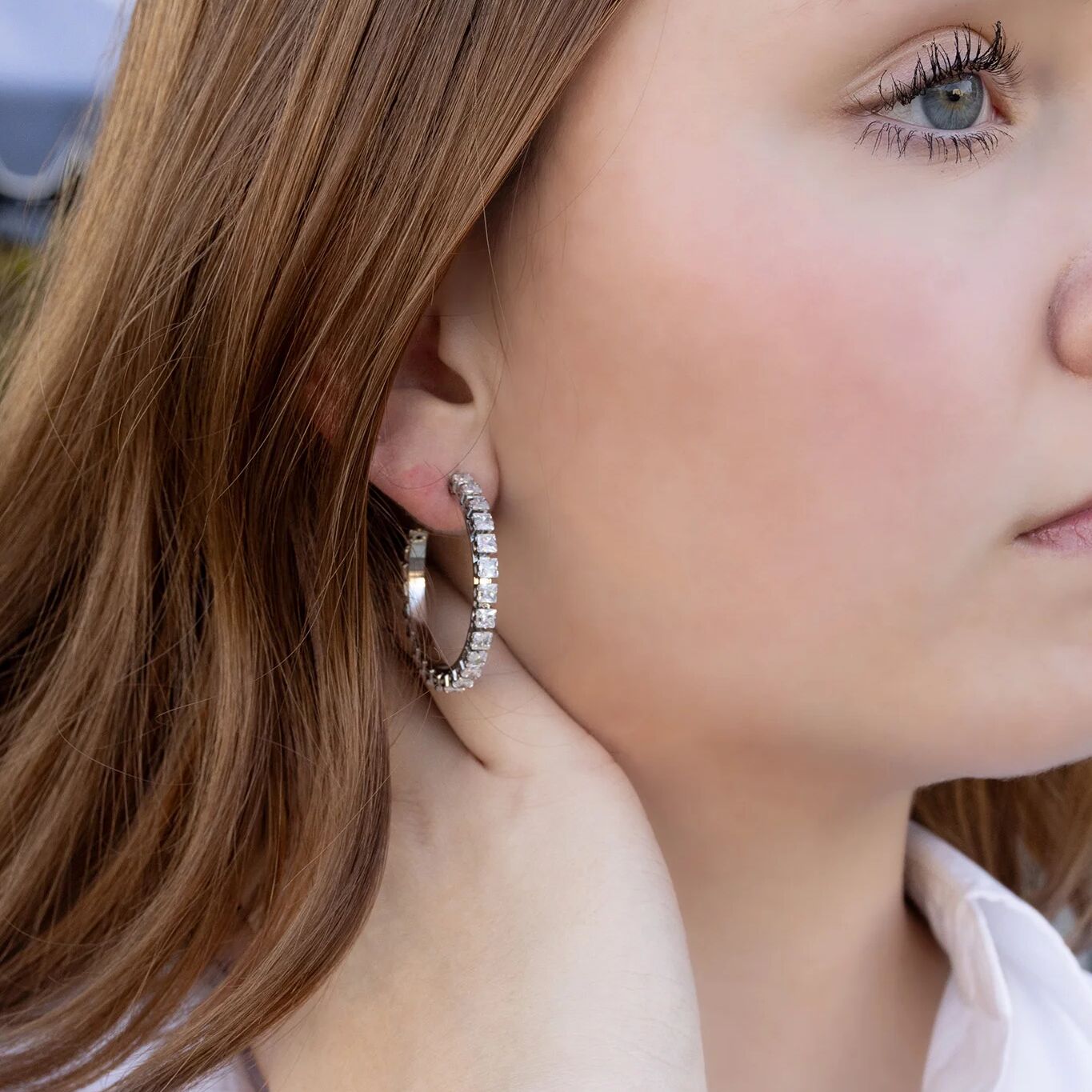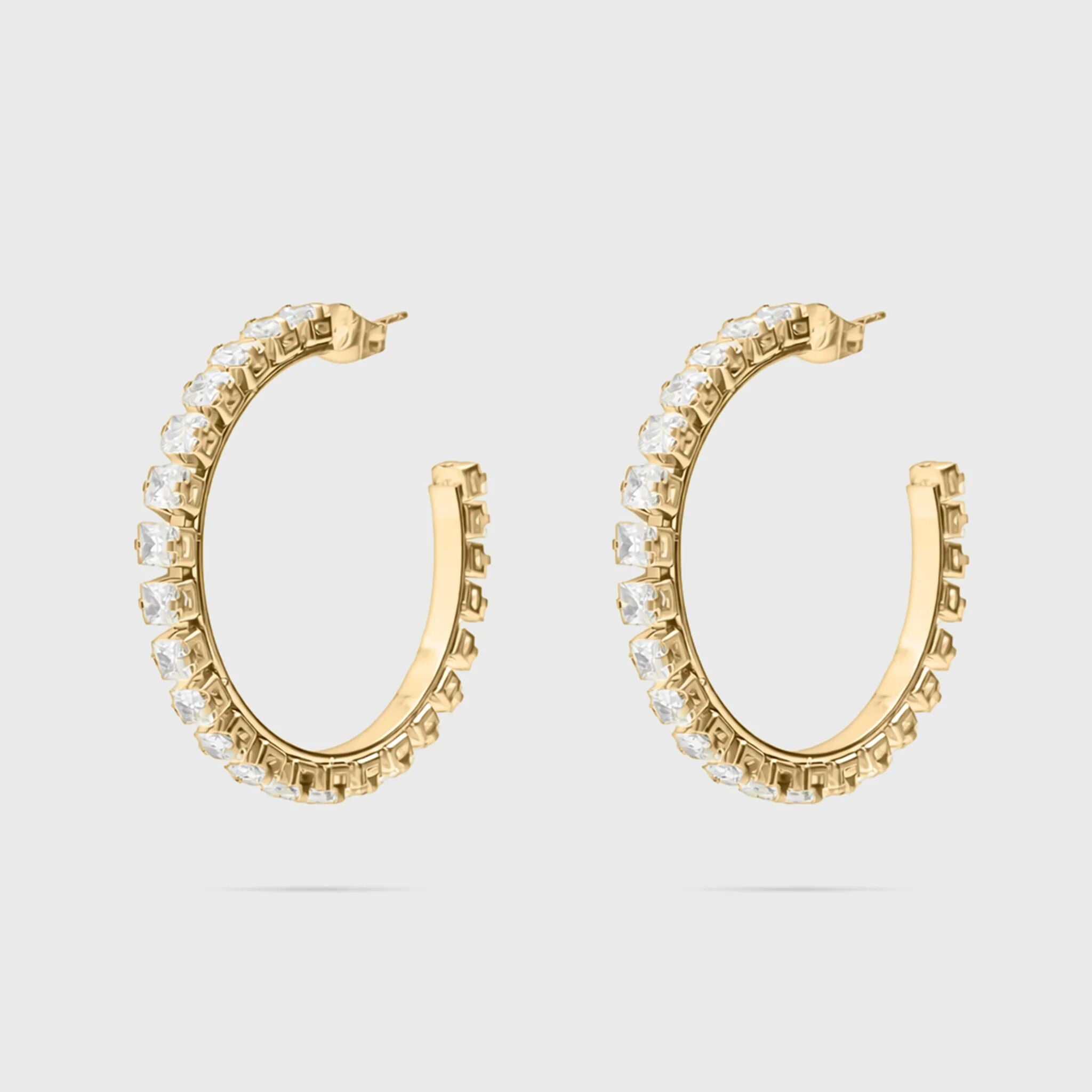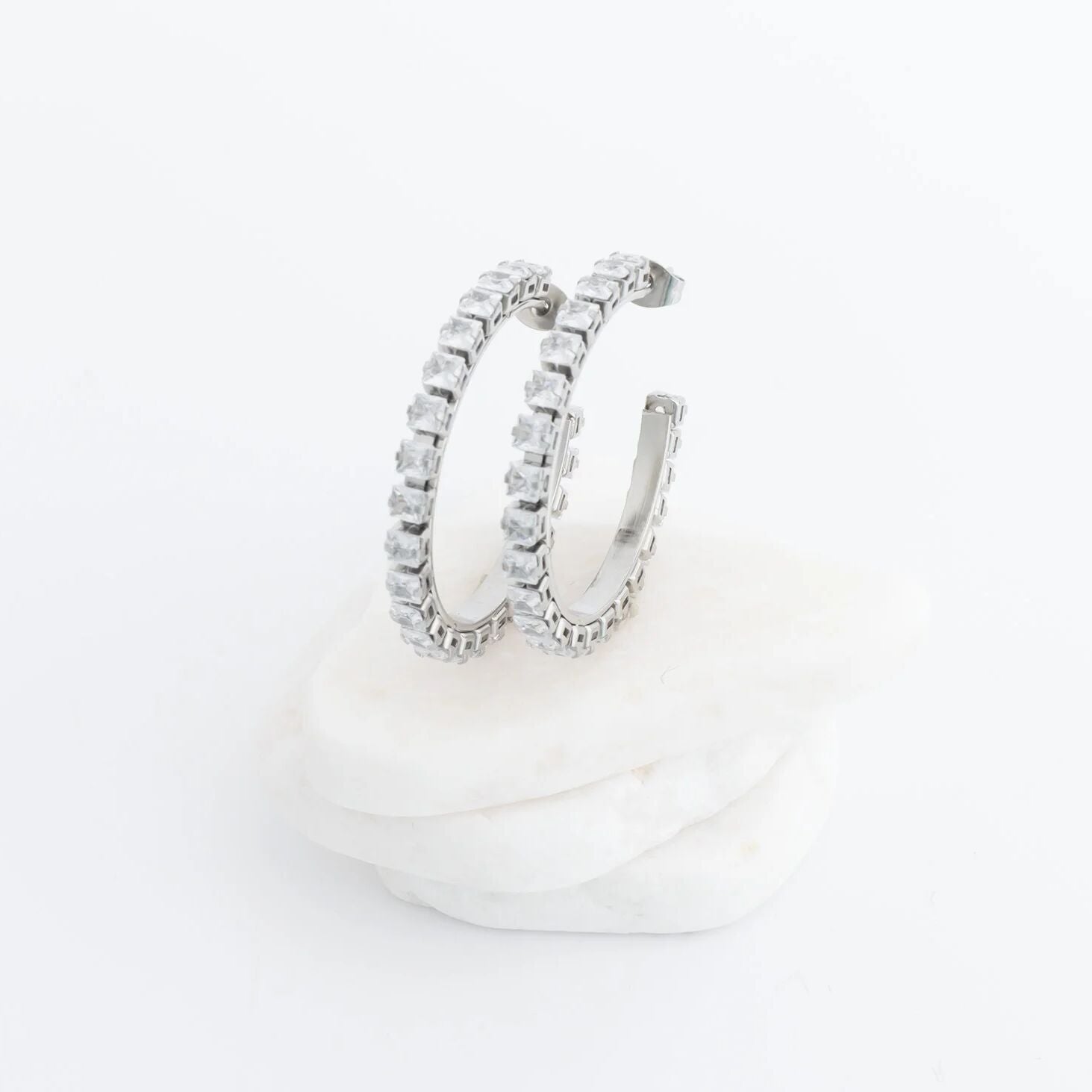 Our Statement CZ Hoop Earrings feature dazzling cubic zirconia stones wrapped gracefully around a sleek, timeless design. These medium sized hoops are lightweight, making it fit comfortably for all day wear. Style them along or pair them with your favorite studs, these earrings add the right amount of sparkle to elevate any look!