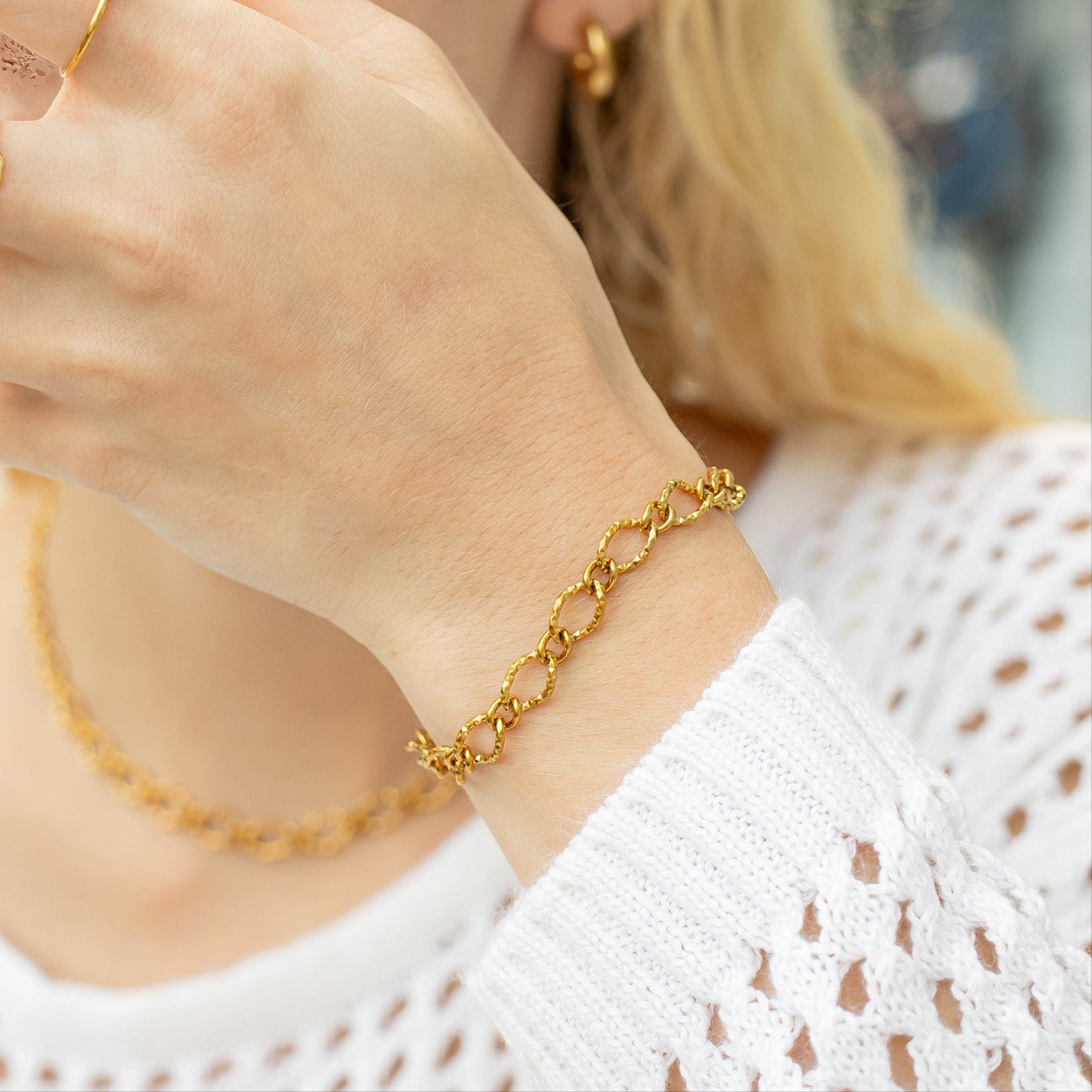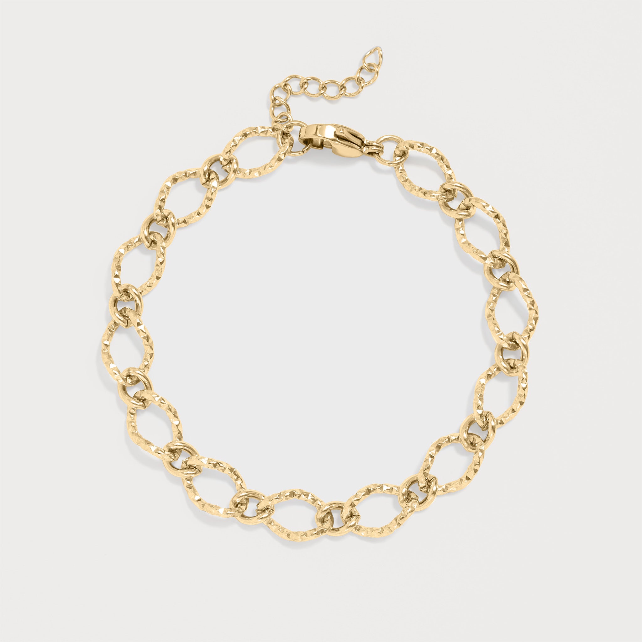 Bold texture meets timeless design in this Hammered Oval Chain Bracelet. Each link is delicately hammered for a light-catching finish that adds dimension and shine. Weather worn alone or stacked, it brings an effortlessly elevated feel to your wrist. Perfect for making everyday outfits feel a little more eclectic or special!