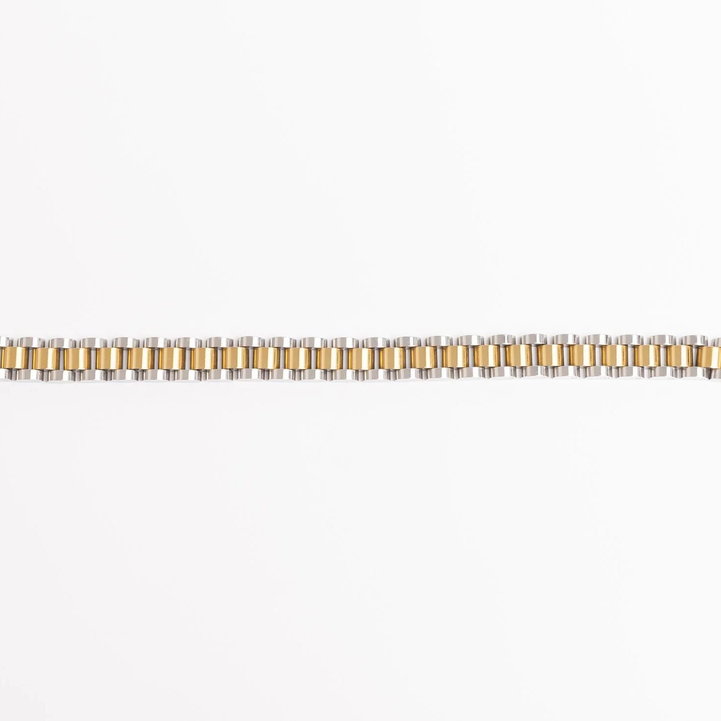 This Mixed Metal Watch Style Bracelet combines two metals for a modern, versatile look that feels both sleek and approachable. Its structured, watch-inspired design sits comfortably on the wrist and pairs easily with other pieces, making it a subtle statement you can wear every day!